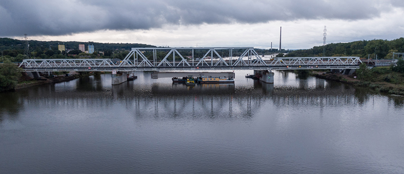 Stalowa konstrukcja mostu przez Regalicę w ciągu ul. Krygiera jest już na swoim miejscu. Pomimo utrudnień spowodowanych wiatrem wykonawca prac – konsorcjum firm Roverpol sp. z o.o. i Rover Infraestructuras S.A. – zakończył podnoszenie siłownikami hydraulicznymi z pontonów wszystkich sekcji mostu, po czym scalił te elementy. Umożliwiło to przystąpienie do prac związanych z wykonaniem żelbetowej płyty pomostu, po której będzie odbywał się ruch. Znaczne siły zaangażowane są obecnie w montaż szalunków i przygotowania do układania zbrojenia, gdyż zakres tych prac jest ogromny. Właściwego ułożenia wymaga blisko 400 t stali zbrojeniowej, a przygotowywane szalunki zostaną docelowo wypełnione betonem w ilości około 1 150 m szesc. Taka objętość odpowiada blisko stu trzydziestu betonowozom.