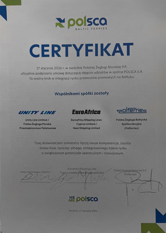Podczas rocznicowych uroczystości przedstawiciele Polskiej Żeglugi Bałtyckiej, Unity Line oraz EuroAfrica Shipping Lines podpisali certyfikat upamiętniający zawartą 27 stycznia br. umowę, dotyczącą objęcia udziałów w spółce POLSCA. Wydarzenie to podkreśliło znaczenie współpracy pomiędzy polskimi armatorami i stanowiło ważny krok w kierunku integracji rynku przewozów promowych na Morzu Bałtyckim, wzmacniając konkurencyjność i stabilność krajowych operatorów promowych.