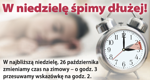 W nocy z soboty na niedzielę, z 25 na 26 października, zmieniamy czas z letniego na zimowy. Wskazówki zegarów cofniemy z godz. 3.00 na 2.00, przez co będziemy spać godzinę dłużej. Do czasu letniego wrócimy w ostatni weekend marca.
