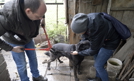 Weterynarz Radosław Fedaczyński przecina łańcuch, na którym przetrzymywano psa na terenie jednego z ogródków działkowych w Przemyślu. Zwierzę było niedożywione, a prowizoryczna buda nie zapewniała mu schronienia przed deszczem i chłodem. Zdaniem weterynarza...