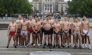 Lider partii Stonoga Partia Polska - Zbigniew Stonoga wraz ze statystami, podczas kręcenia spotu wyborczego przed PKiN w Warszawie. Każdy chętny mógł zgłosić się do udziału w nagraniu spotu i zarobić 50 złotych. Warunkiem było rozebranie się do bielizny. Fot...