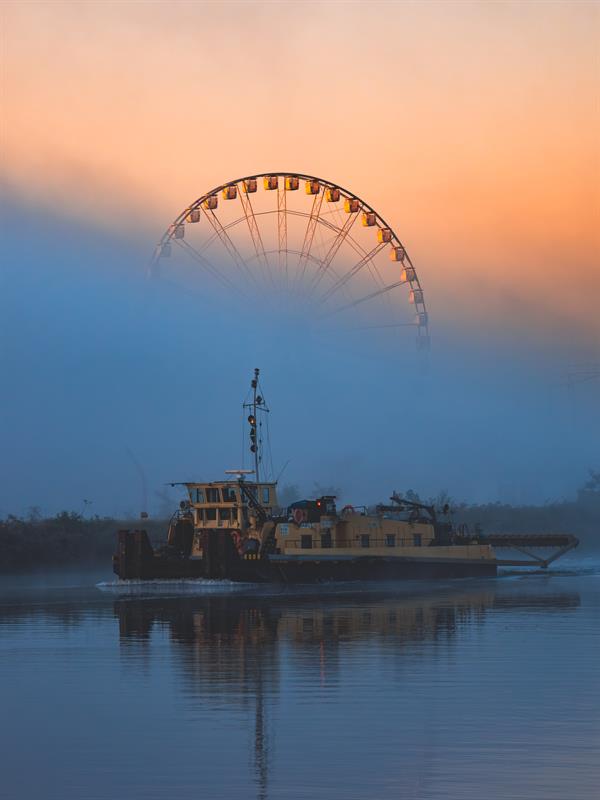 Zdjęcie przedstawia łódź płynącą po Odrze o poranku, w tle – w gęstej mgle – wyłania się diabelski młyn, czyli Wheel of Szczecin.