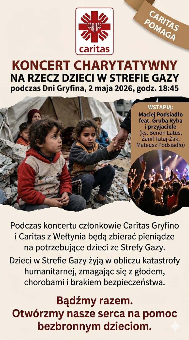 W trakcie koncertu w porozumieniu z Caritas Archidiecezji Szczecińsko-Kamieńskiej zbierane będą środki na pomoc dzieciom w strefie Gazy.