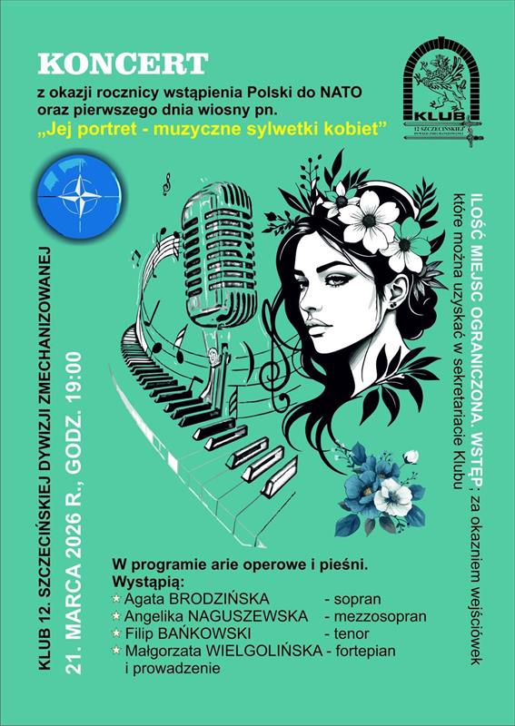 Klub 12. Szczecińskiej Dywizji Zmechanizowanej przy ul. Wawrzyniaka 5 zaprasza w sobotę 21 marca o godz. 19 na Koncert z okazji rocznicy wstąpienia Polski do NATO oraz pierwszego dnia wiosny.