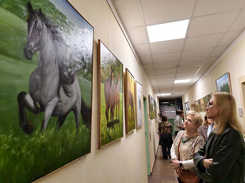 – Zwierzaki lubię, po prostu i uważam, że warto je pokazywać – mówiła podczas wernisażu artystka. – Na konia nie wsiądę, bo miałam pewne przeżycia, ale oglądać i malować te zwierzęta uwielbiam. Są pełne wdzięku i majestatu. Korzystam ze zdjęć, kalendarzy z końmi. Zatrzymuję je na swoich płótnach.