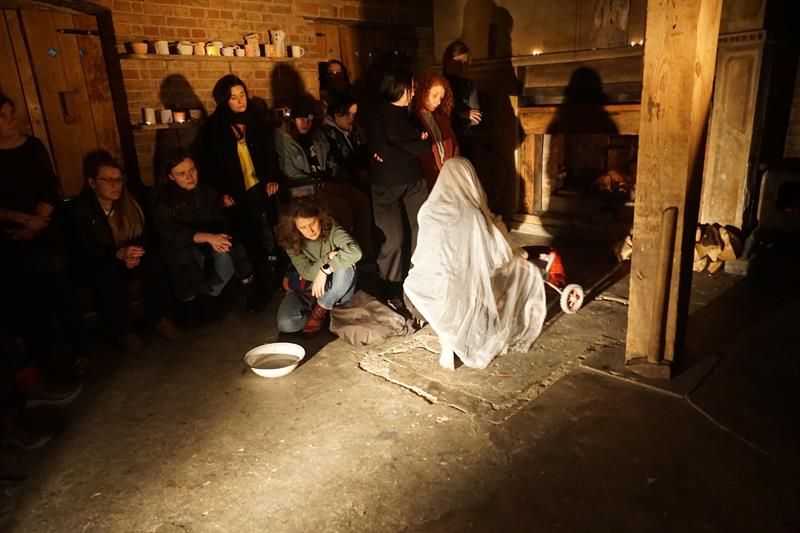 W jej artystycznym widowisku widzimy takie elementy jak dziecięcy wózek, ziemia, woda, ogień oraz strój – z początku biały (nawiązujący do Europy Wschodniej) i następnie czarny symbolizujący lęk i żałobę. Dodatkowo przekaz wzmacnia widoczny za performerką jej własny cień, który jest echem przeszłości, przodkami stale towarzyszącymi każdemu z nas. Jest też krew widoczna na stopie – to zapewne nawiązanie do przemieszczania się, do wypędzenia z ojczystej ziemi, którą trzeba było opuścić. Często boso i w pospiechu…