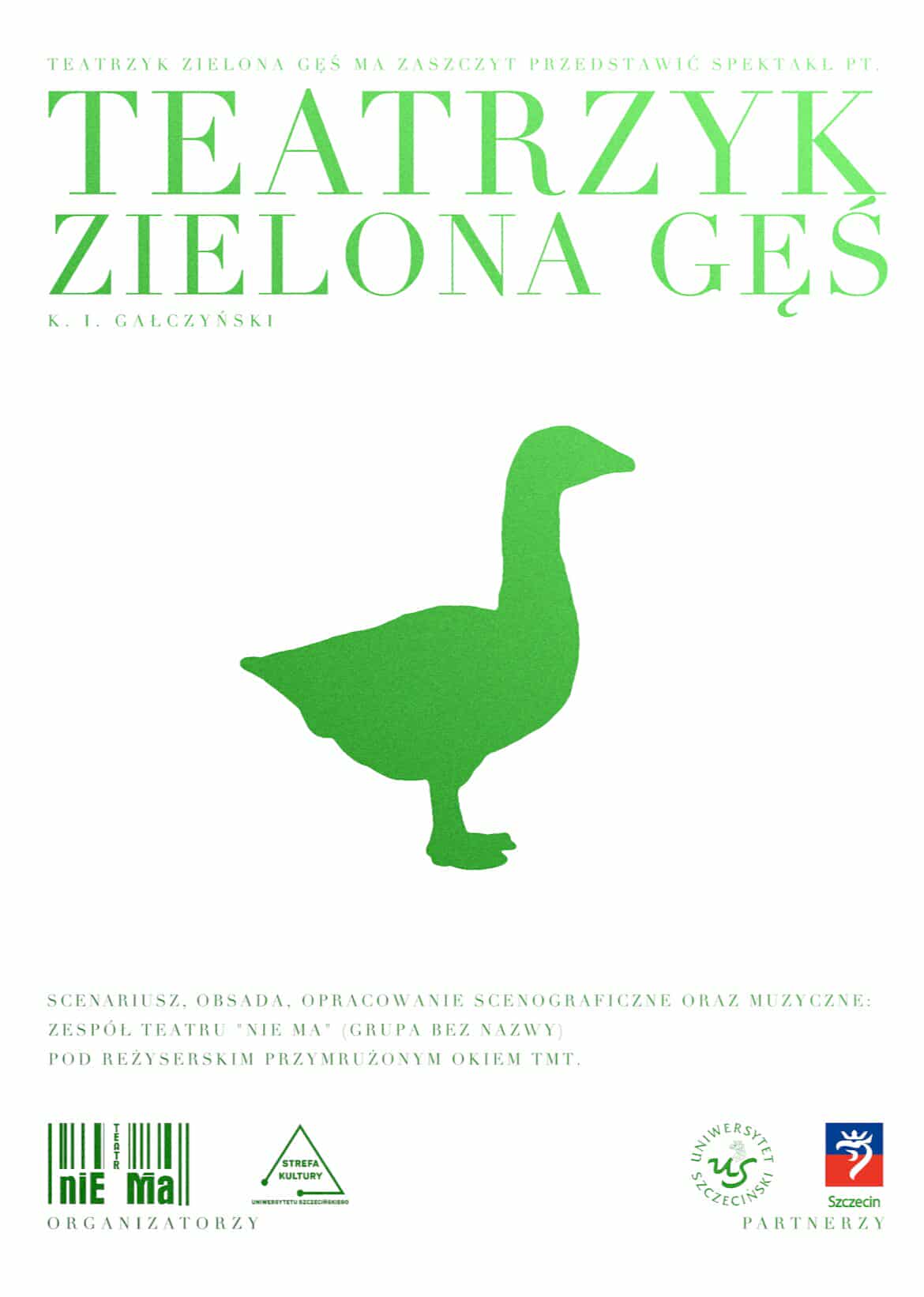 Teatr „nie ma”, autorski projekt Tatiany Malinowskiej-Tyszkiewicz, we współpracy ze Strefą Kultury Studenckiej Uniwersytetu Szczecińskiego, zaprasza na spektakl „Teatrzyk Zielona Gęś” K.I. Gałczyńskiego. Odbędzie się w piątek, 30 stycznia, o godzinie 20 w siedzibie teatru przy ul. Szwoleżerów 18A w Szczecinie. Wstęp wolny – nie obowiązują bilety.