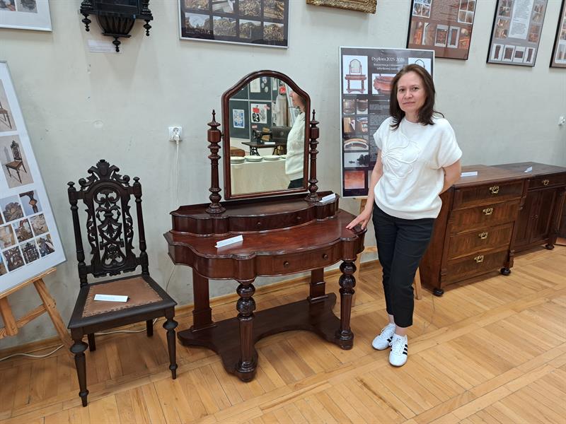 Nie mniej ciekawie prezentują się dyplomy z konserwacji mebli. Większość obiektów to poddane renowacji w ramach dyplomu meble z końca XIX wieku należące do niemieckiego stylu gründerzeit. Tego typu meble w Polsce zwykło się określać jako „eklektyczne”, choć w rzeczywistości gründerzeit to raczej odłam neorenesansu. Ciekawym meblem poddanym renowacji przez Oliwię Stefańską jest mahoniowa toaletka z pierwszej połowy XIX w. Jak tłumaczy nauczycielka renowacji Magda Wierucka, toaletka prawdopodobnie pochodzi z Anglii lub Francji. ©℗