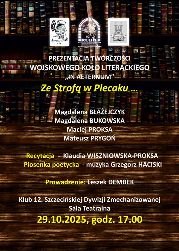 Klub 12. Szczecińskiej Dywizji Zmechanizowanej zaprasza mieszkańców Szczecina w środę 29 października o godz. 17 na spotkanie z twórczością Wojskowego Koła Literackiego „In Aeternum” pt. „Strofy w plecaku”. Uczestnikami tego spotkania będzie młoda generacja literatów: Magda Błażejczyk, Magdalena Bukowska, M.P. Hardy, Mateusz Prygoń. Spotkanie odbędzie się w Klubie „Dwunastki” przy ul. Wawrzyniaka w Szczecinie, w Sali Teatralnej. Wstęp wolny.