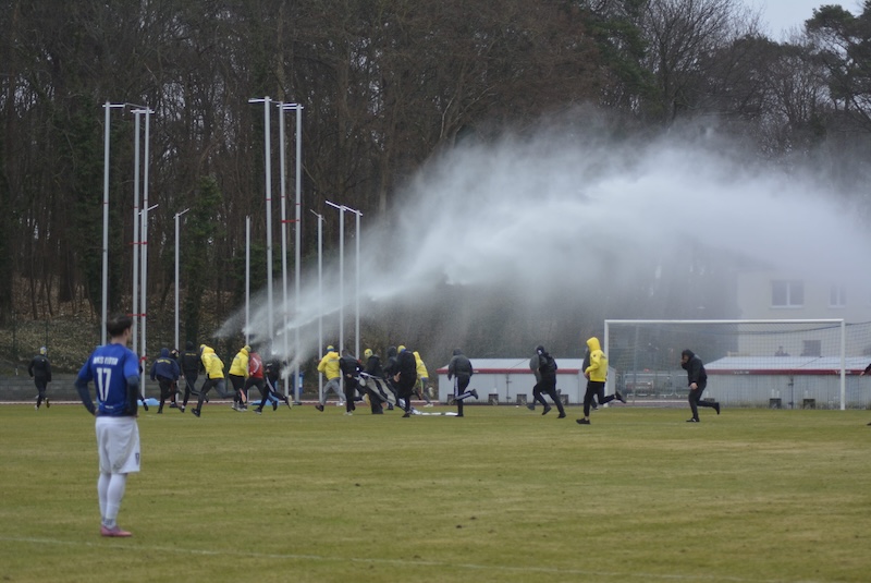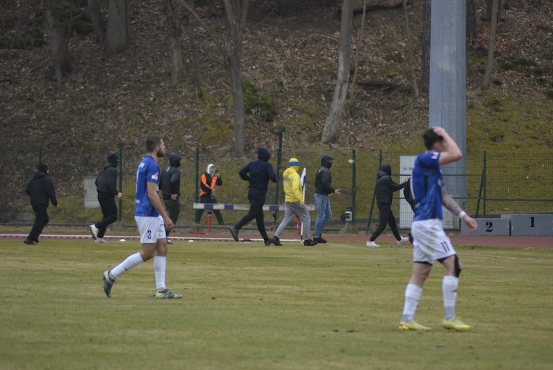 Po pierwszej części gry, która obfitowała w ostrą fizyczną grę, z prowadzeniem do szatni schodzili zawodnicy Floty. Mecz był raczej z gatunku tych, które lubią koneserzy męskiej gry, aniżeli miłośnicy finezyjnych prób rozegrania piłki. Druga połowa przez długi czas wyglądała jak kopia pierwszej. Dużo fizycznej gry i niewiele konkretów pod bramkami. Do około 65. minuty spotkanie nie rozpieszczało tempem ani liczbą okazji. Wówczas na trybunach i również na płycie boiska doszło do skandalicznych ekscesów, które opiszemy w osobnym akapicie. Wracając do wydarzeń sportowych. dodajmy, że bramkarze pozostawali praktycznie bezrobotni, a arbiter nie miał powodów do częstych interwencji, bo mimo ostrej gry, zawodnicy trzymali się w granicach przepisów i szanowali się nawzajem. Przełom przyszedł po kontrowersyjnej decyzji sędziego w końcówce w jednej ze spornych sytuacji, gdy faulowany był naszym zdaniem zawodnik Floty, a odgwizdano przewinienie na korzyść gości. Po rzucie wolnym Elana doprowadziła do zamieszania w polu karnym i wyrównała na 1:1. Gospodarze odpowiedzieli błyskawicznie i tuż po wznowieniu gry Flota ponownie objęła prowadzenie, wykorzystując moment dekoncentracji rywali. Stadion odżył, a wydawało się, że trzy punkty zostaną w Świnoujściu. Końcówka była jednak nerwowa. Elana nie odpuszczała i do samego końca naciskała, a doliczony czas gry był długi, między innymi przez przerwy związane z wydarzeniami na trybunach. Flota starała się grać ostrożnie, unikając fauli w okolicach własnego pola karnego. Mimo to, w niemal ostatniej akcji meczu, w ostatniej minucie doliczonego czasu, goście doprowadzili do wyrównania.