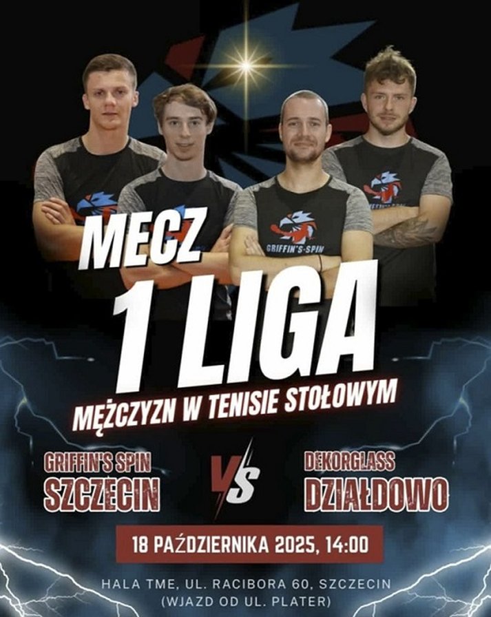 W sobotę 18 października rozegrany zostanie mecz I ligi mężczyzn, w którym zmierzą się Griffin's-Spin Szczecin i Dekorglass Działdowo II. Spotkanie odbędzie się w Hali TME przy ul. Racibora 60 w Szczecinie. Początek o godz. 14.