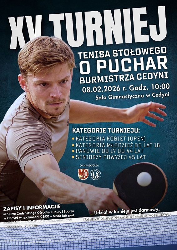 Cedyński Ośrodek Kultury i Sportu zaprasza na XV edycję Turnieju Tenisa Stołowego o Puchar Burmistrza Cedyni, która odbędzie się 8 lutego o godz. 10 w sali gimnastycznej w Cedyni. Turniej skierowany jest do mieszkańców gminy oraz wszystkich miłośników tenisa stołowego, niezależnie od poziomu zaawansowania. Wydarzenie ma na celu popularyzację aktywności fizycznej, promowanie sportowej rywalizacji w duchu fair play oraz integrację lokalnej społeczności.