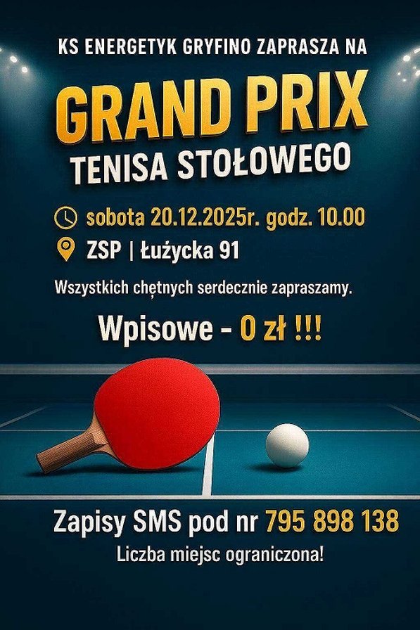 W sobotę 20 grudnia odbędzie się w Gryfinie - Grand Prix Tenisa Stołowego, którego organizatorem jest klub Energetyk Gryfino.