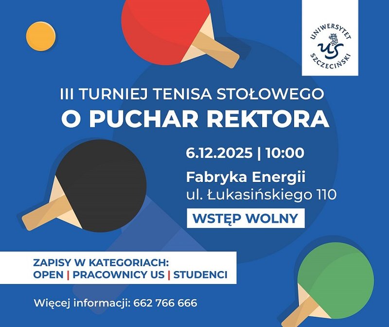 6 grudnia rozegrany zostanie III Turniej o Puchar Rektora Uniwersytetu Szczecińskiego. Kategorie: Studenci (start godz. 10), Pracownicy US (godz. 13), OPEN (godz. 14). Zapisy obowiązują do 5 grudnia do godz. 15. W niedzielę 7 grudnia wystartuje turniej dla dzieci i młodzieży pn. "FETS Kids+ gramy o uśmiech Rektora Uniwersytetu Szczecińskiego". Zapisy na turniej przyjmowane są do soboty 6 grudnia do godz. 19. Start o godz. 10. Wstęp na wszystkie wydarzenia jest wolny. Miejsce: Fabryka Energii ul. Łukasińskiego 110.