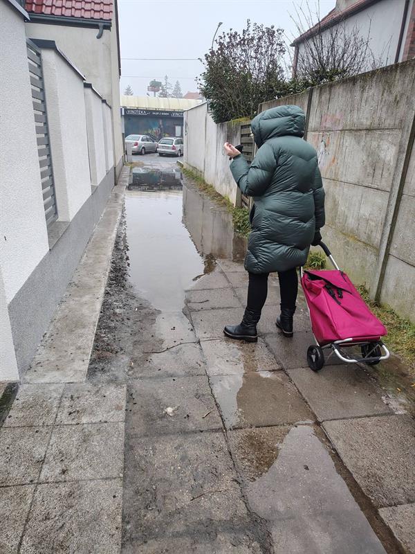 Widać rozległą stojącą kałużę, a pod nią chodnik – zatopiony niemal na całej długości. Jedna z kobiet bezradnie staje przed tą przeszkodą. Druga stara się ją pokonać, przechodząc niemal przyklejona do ściany budynku.