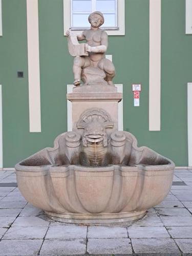 Fontanna „Chłopiec z harmonią” powstała w 1927 roku. Wykonał ją rzeźbiarz Hermann Hosaeus z Berlina, profesor tamtejszej Akademii. Materiał wykorzystany do jej budowy to sudecki piaskowiec. Fontanna składa się z ozdobnej misy w formie muszli, na której umieszczony jest duży sum. W jego paszczy znajduje się otwór na wydobywającą się wodę. Całość wieńczy postać chłopca trzymającego w rękach harmonię. Na cokole po lewej stronie widnieje podpis autora. Pomnik był dwa razy rekonstruowany. Został uszkodzony podczas II wojny światowej – chłopiec miał utrącone ręce, także zniszczeniu uległa część harmonii. Ubytki były uzupełniane w latach 60 i w 1995 r. pod kierunkiem Lidii Piotrowskiej-Cześnik.