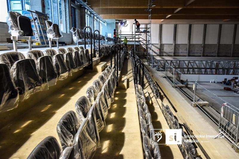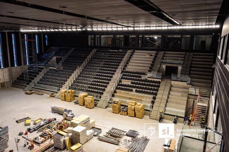 Nowy Szczecińskim Domu Sportu wygląda już prawie na gotowy. Na trybunach hali montowane są krzesełek, a równocześnie prowadzone są prace wykończeniowe. Obejmują one malowanie, montaż sufitów podwieszonych, balustrad, okładzin ceramicznych, wykładzin PCV oraz drzwi.