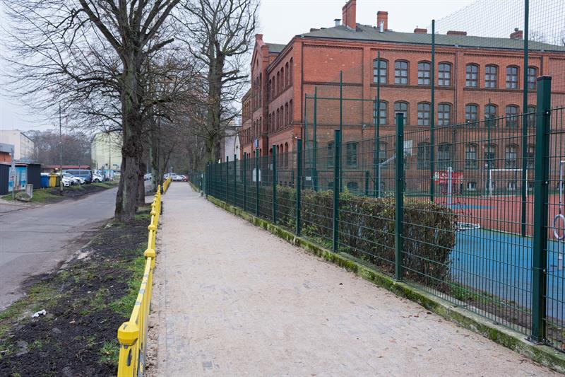 Inwestycja obejmowała budowę nowego ciągu pieszego na odcinku o długości 115 metrów, rozciągającym się od ul. Dziennikarskiej do ul. Anieli Krzywoń. Dotychczasowa, zużyta nawierzchnia została zastąpiona nową konstrukcją wykonaną z kostki betonowej. Prace rozpoczęły się jesienią 2025 roku od technicznych cięć drzew w pasie drogowym, po których nastąpił demontaż starej nawierzchni, przygotowanie podłoża i ułożenie nowej kostki. Wykonawcą zadania była firma Elbud Szczecin Sp. z o.o., a łączny koszt inwestycji wyniósł 160 000 zł. Celem modernizacji była poprawa parametrów technicznych i funkcjonalnych drogi dla pieszych, prowadzącej do placówki edukacyjnej.