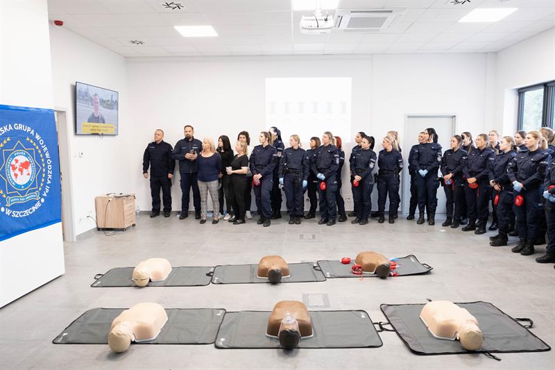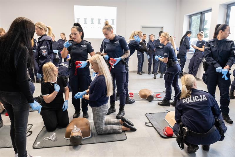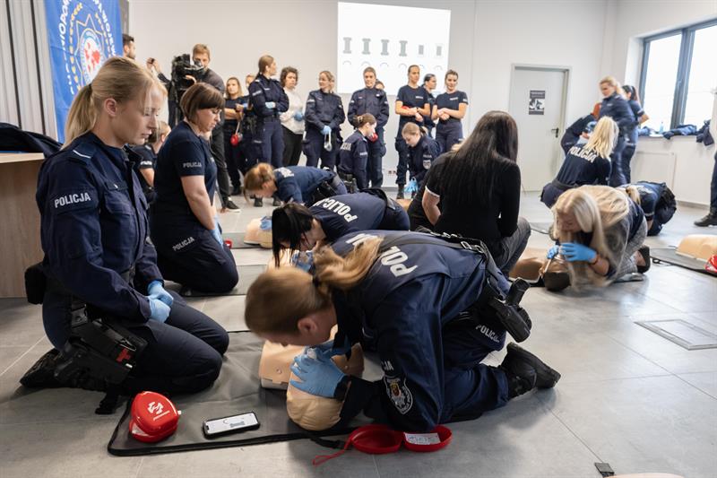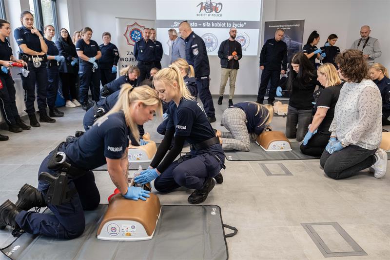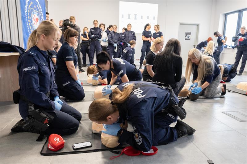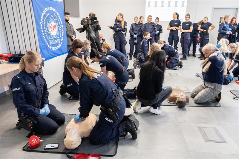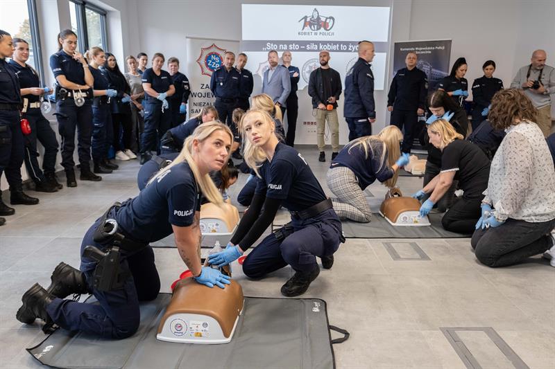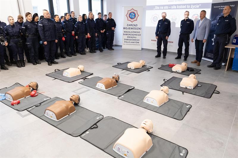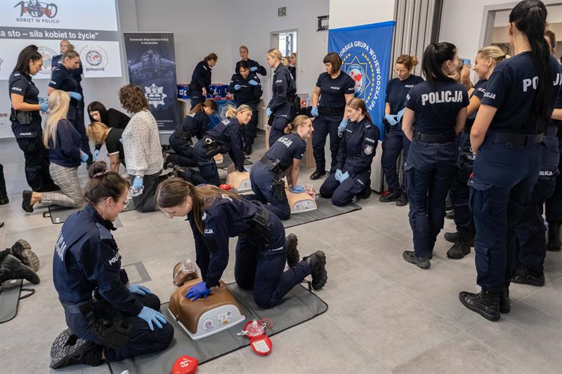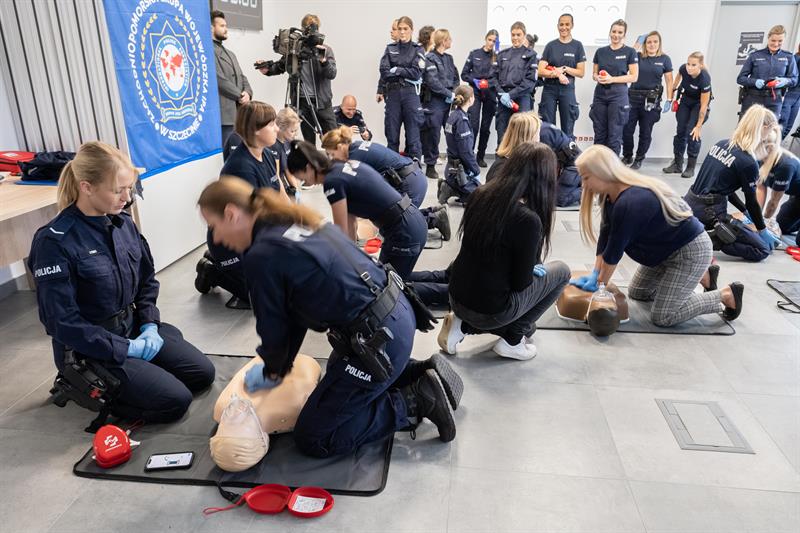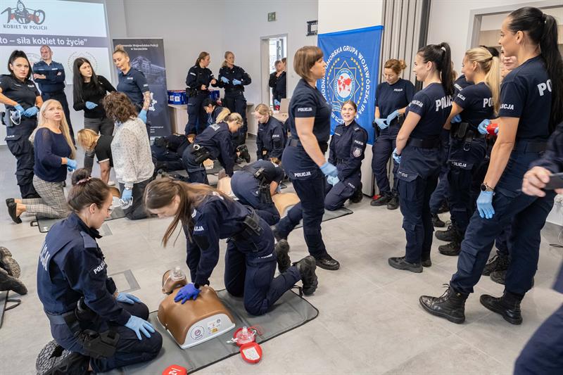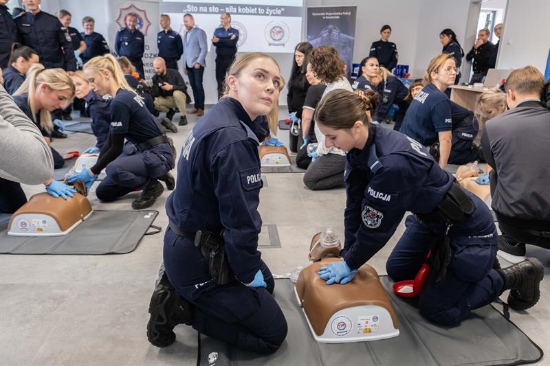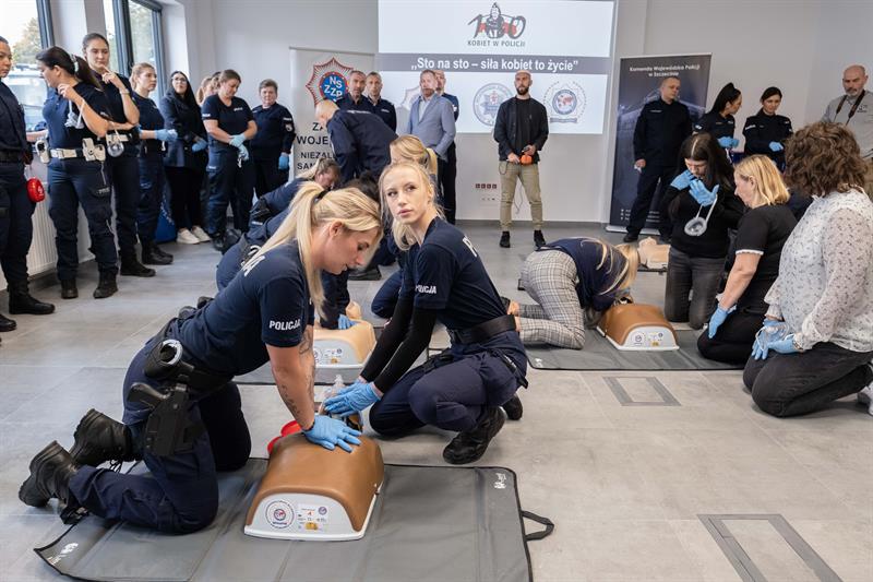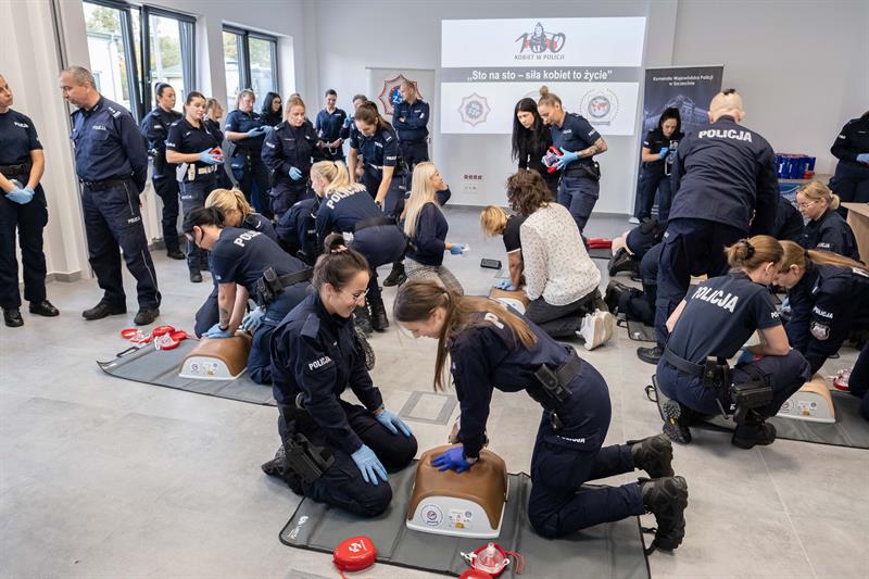 W Centrum Szkolenia Policji przy ulicy Wernyhory w Szczecinie odbyła się w czwartek pokazowa akcja resuscytacji krążeniowo-oddechowej. W ćwiczeniu wzięło udział 48 policjantek z garnizonu zachodniopomorskiego. Przez sto minut, na dziewięciu manekinach, funkcjonariuszki nieprzerwanie prowadziły resuscytację. W ten sposób uczciły stulecie obecności kobiet w policji oraz Międzynarodowy Dzień Przywracania Czynności Serca.