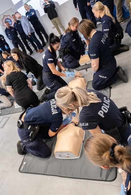 W centrum szkoleniowym ustawiono dziewięć stanowisk z nowoczesnymi manekinami, które pokazują tempo i siłę ucisków klatki piersiowej oraz jakość wentylacji. Policjantki pracowały zespołowo, zmieniając się przy manekinach tak, by przez sto minut nieprzerwanie prowadzić działania.