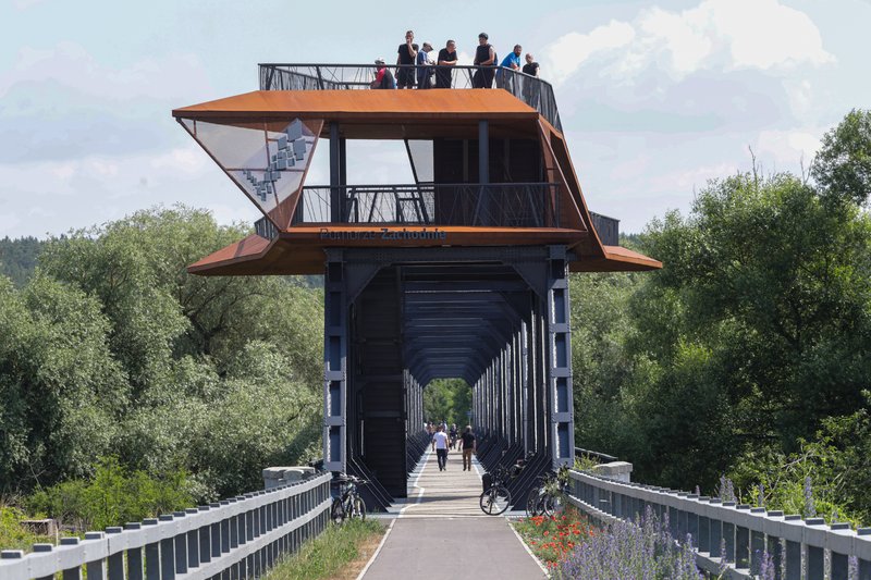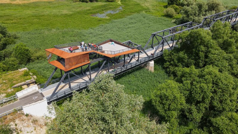 Adaptacja zabytkowego mostu kolejowego w Siekierkach, który powstał w 1936 roku, przekształciła dawną przeprawę graniczną w pieszo-rowerowy most z platformą widokową. Dwukondygnacyjna konstrukcja jest wyposażona w miejsca odpoczynku i schronienia z zachowaniem oryginalnej struktury dziewięciu kratownic. Jest to projekt autorstwa biura Zespół MXL4 (architekci Tomasz Maksymiuk i Aleksandra Cegielska).