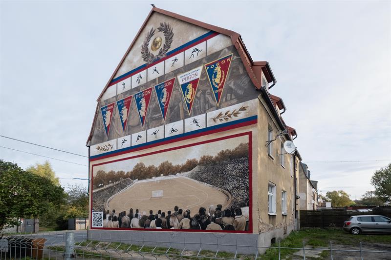 Ponad panoramą stadionu umieszczono piktogramy symbolizujące różne dyscypliny sportowe, w których Pogoń prowadziła swoje sekcje, m.in. piłkę nożną, siatkówkę, koszykówkę, żeglarstwo, lekkoatletykę i zapasy. Towarzyszą im herby poszczególnych sekcji, przypominające o wielosekcyjnej historii klubu. Mural przy Gryfińskiej 129 jest częścią miejskiego projektu poświęconego Pogoni Szczecin, realizowanego w ramach inicjatywy SBO i finansowanej przez Miasto Szczecin.