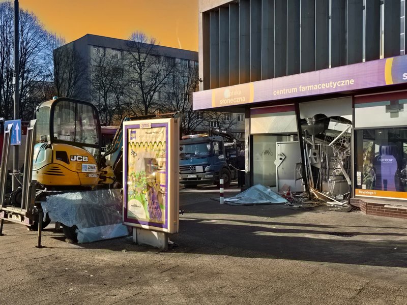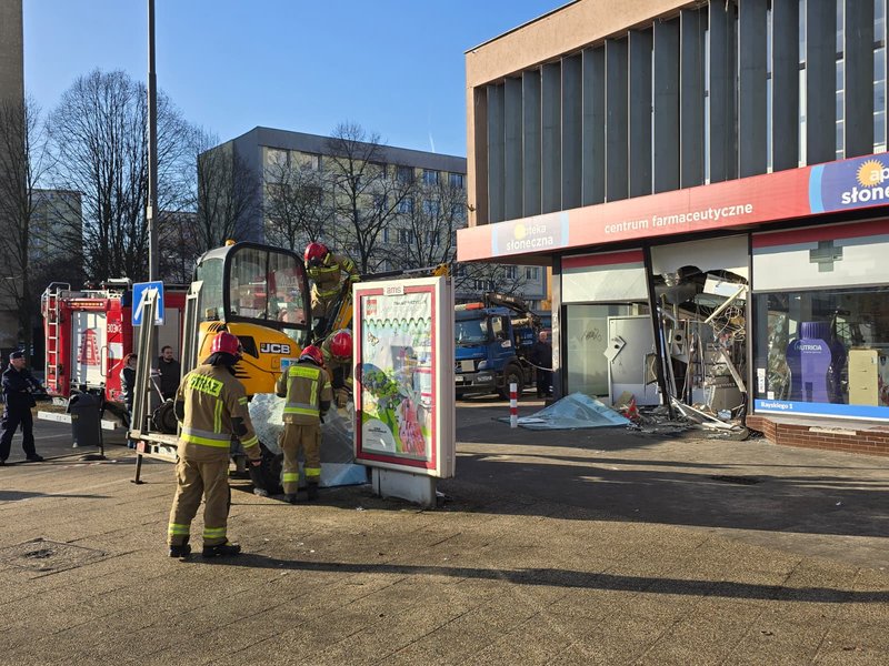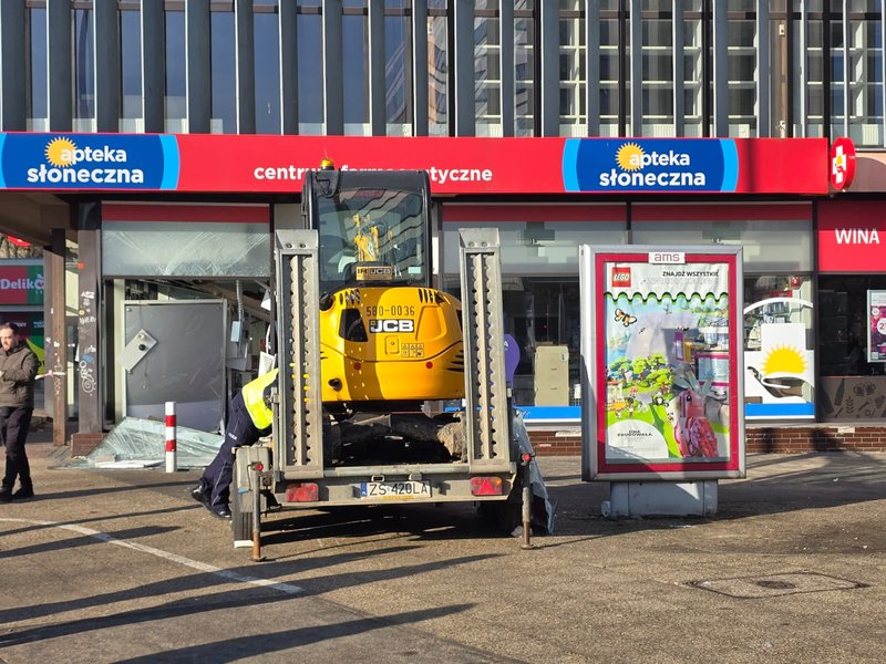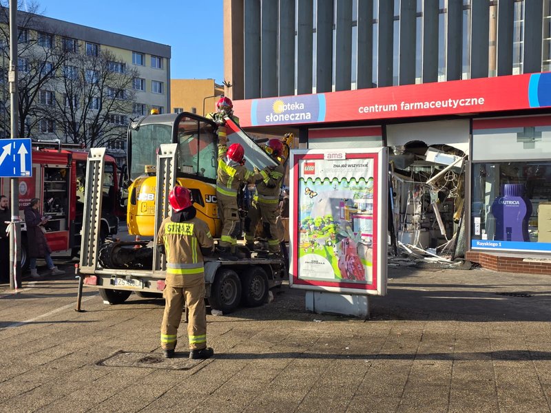 Naczepa z koparką odczepiła się od pojazdu i wjechała w aptekę na ul. Rayskiego w Szczecinie (budynek dawnego Cezasu). Do zdarzenia doszło w czwartek 26 lutego ok. godz. 8.