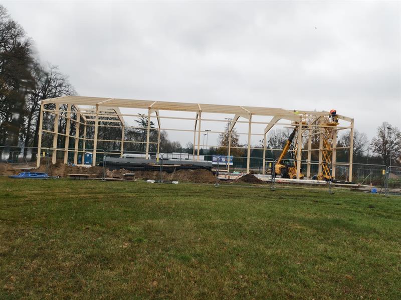 Zakończono już roboty fundamentowe oraz rozprowadzenie wewnętrznych instalacji wodno-kanalizacyjnych. Obecnie trwa montaż drewnianej konstrukcji budynku.