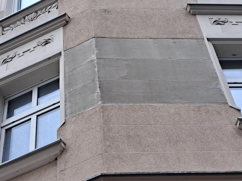 Chodzi o pionowe, faliste bruzdy w tynku przypominające prążki. Ten zabieg dekoracyjny spotykany w architekturze początku XX wieku był autentycznym ewenementem w skali całego Szczecina. Teraz elewacja jest gładka i po bruzdach nie ma śladu.