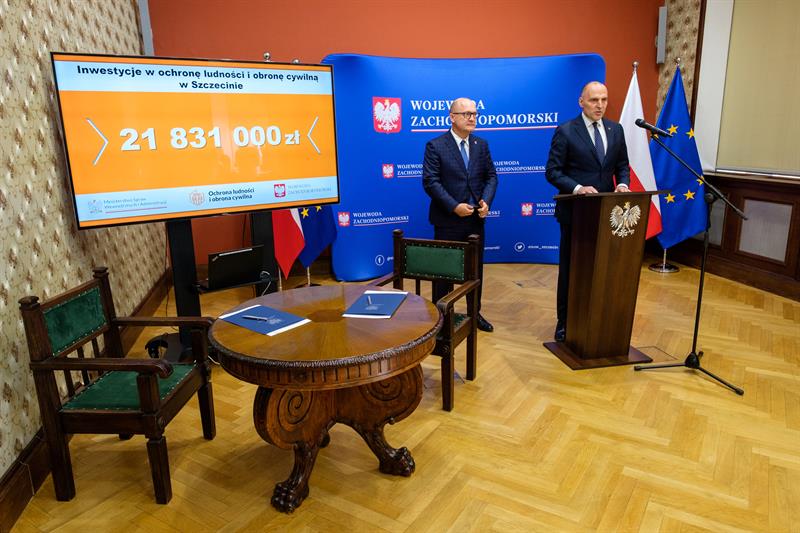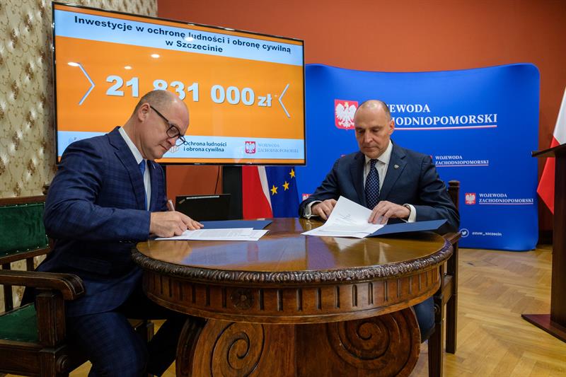 W Urzędzie Wojewódzkim podpisano umowę dotyczącą przekazania środków na zadania z zakresu ochrony ludności i obrony cywilnej. Dokument sygnowali wojewoda zachodniopomorski Adam Rudawski oraz prezydent Szczecina Piotr Krzystek. W ramach porozumienia do miasta trafi 21,83 mln zł, które zostaną przeznaczone na zakup sprzętu i wyposażenia niezbędnego do zapewnienia bezpieczeństwa mieszkańcom.