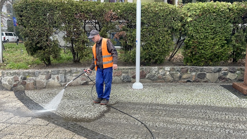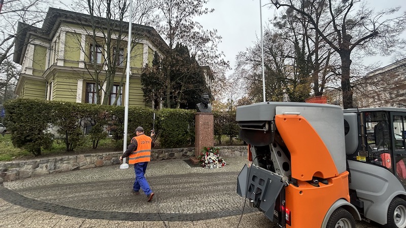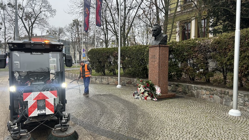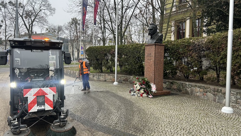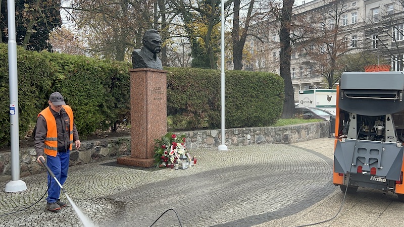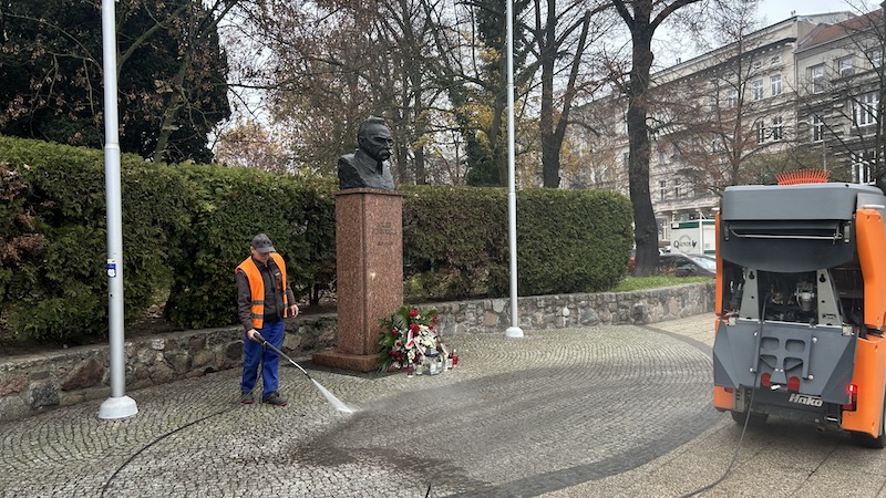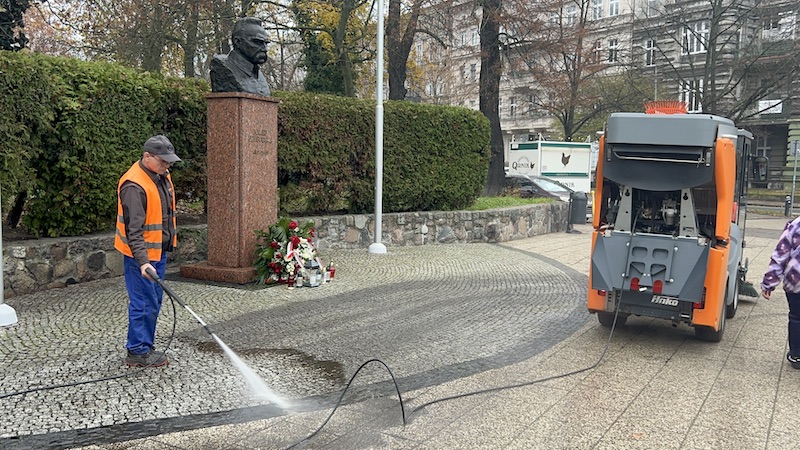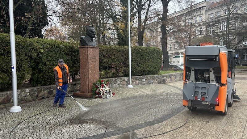 Przed wtorkowym Świętem Niepodległości jeszcze w poniedziałek trwały ostatnie prace porządkowe na placu Szarych Szeregów w Szczecinie, a konkretnie wokół pomnika marszałka Józefa Piłsudskiego. Służby miejskie jak co roku czyściły metodą mycia ciśnieniowego bezpośrednie otoczenie pomnika, jak również, nieco wcześniej, samo popiersie Marszałka.