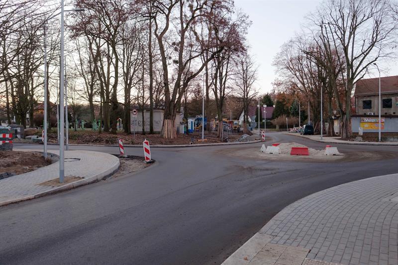 Dobre wiadomości napływają również z ulicy Smoczej. Odcinek od nowego ronda do ulicy Falskiego znajduje się już w zaawansowanym stanie realizacji i jest przejezdny w obu kierunkach. Wykonano tam nowe krawężniki, powstały zatoki dla samochodów, a na części jezdni ułożono już nową nawierzchnię asfaltową. W rejonie skrzyżowania ulic Skalistej, Smoczej, Przewiewnej i Krzemiennej powstało nowe rondo, gdzie obecnie trwa montaż oświetlenia ulicznego.