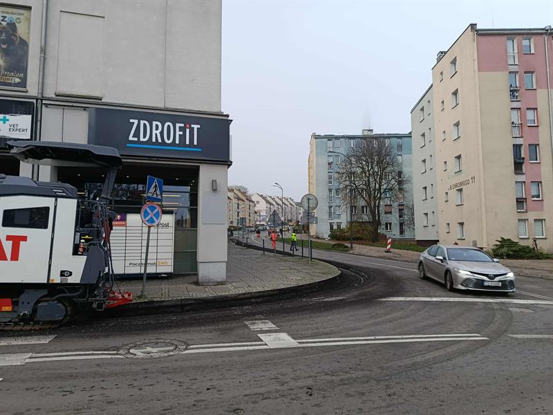 Prace drogowe przesunęły się teraz w rejon skrzyżowania z ul. Kazimierza Wielkiego, w pobliżu wjazdu na parking Galerii Handlowej Starówka.