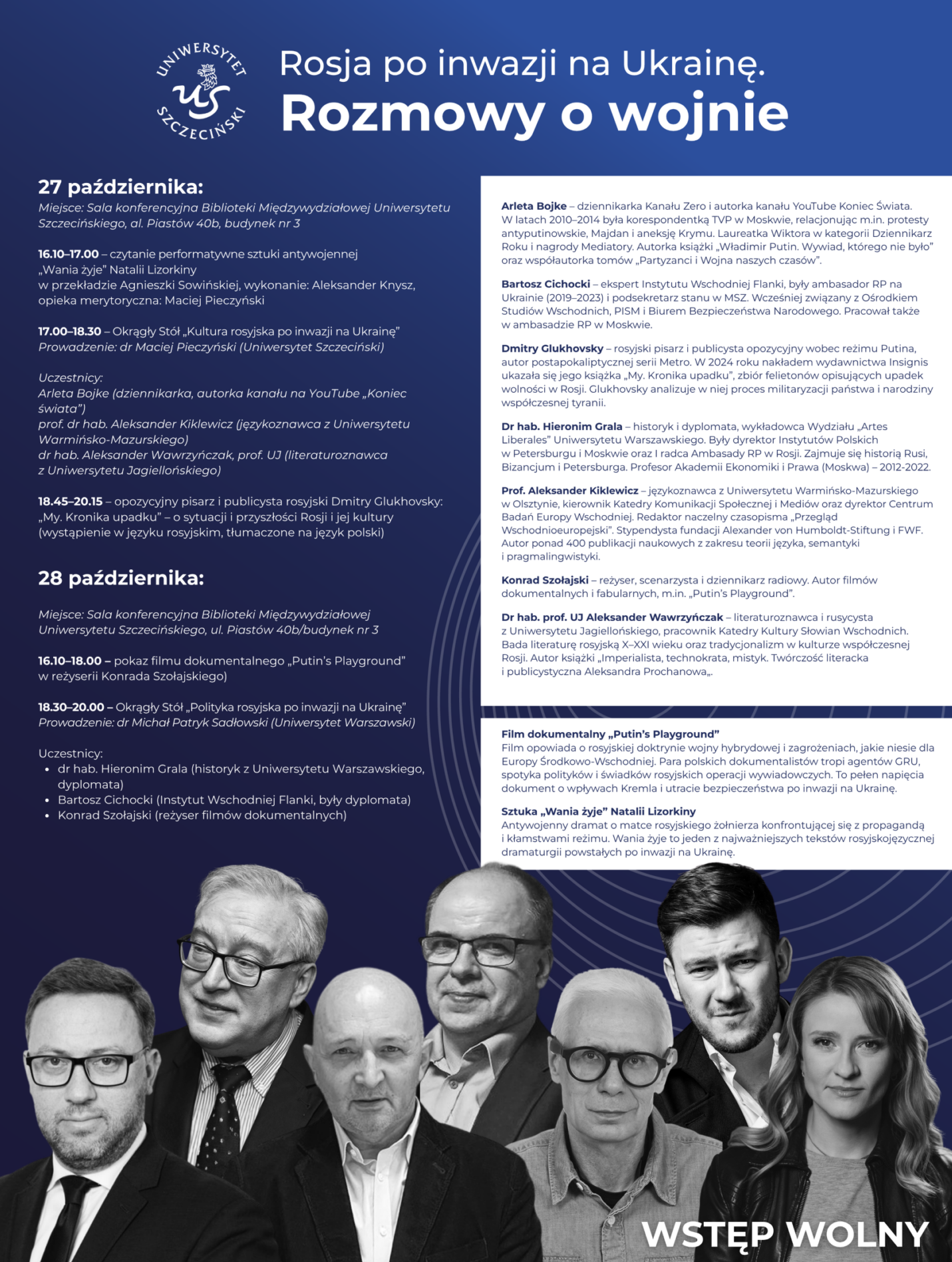 Konferencji naukowej będą towarzyszyły także dyskusje akademickie. „Rosja po inwazji na Ukrainę. Rozmowy o wojnie” – to propozycja skierowana do szerokiej publiczności, zainteresowanej tematyką konfliktu za naszą wschodnią granicą.