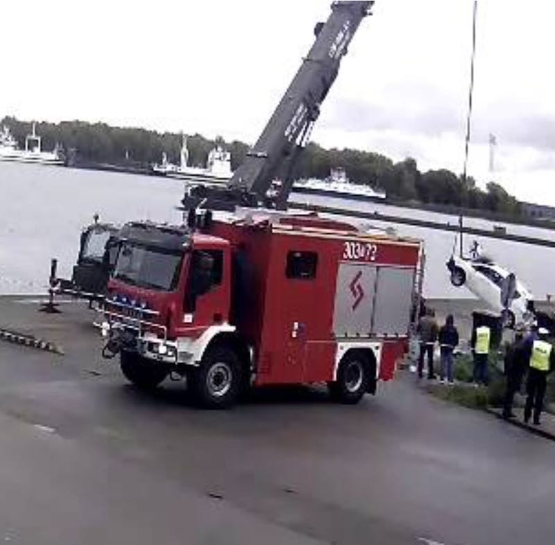 Pojazd wydobył na brzeg specjalistyczny dźwig. Nabrzeże opuściły już wszystkie służby biorące udział w akcji.