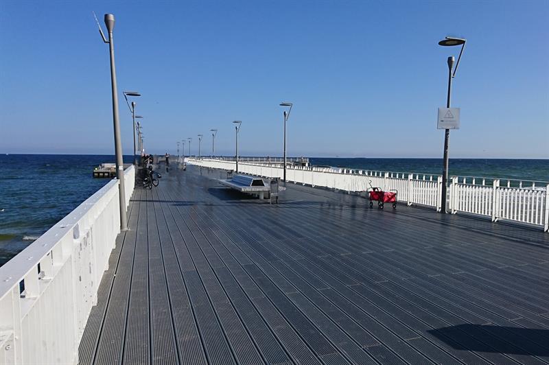 Kołobrzeskie molo zostało wzniesione w 1971 roku. Konstrukcja pomostu ma 220 m długości i 9 m szerokości. Na jego końcu znajduje się dwupoziomowa głowica z kawiarnią w dolnej części. ©℗