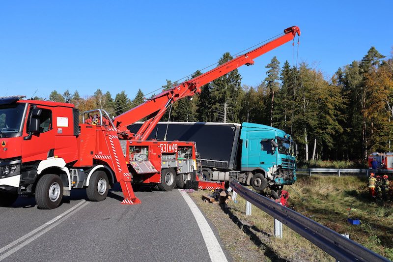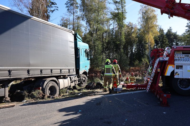 Z pierwszych ustaleń wynika, że ciężarówka uderzyła i zepchnęła do rowu auto osobowe, a następnie je przygniotła i zmiażdżyła.