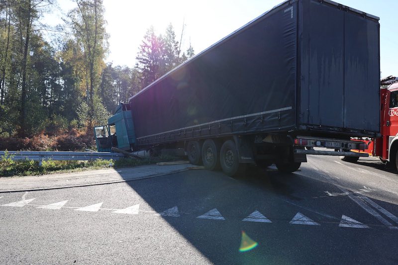 Lekarz LPR stwierdził zgon 50-letniego mężczyzny, który jechał samochodem nauki jazdy. Do szpitala z urazem nogi trafił 68-letni kierowca ciężarówki. Jego stan jest określany jako stabilny.