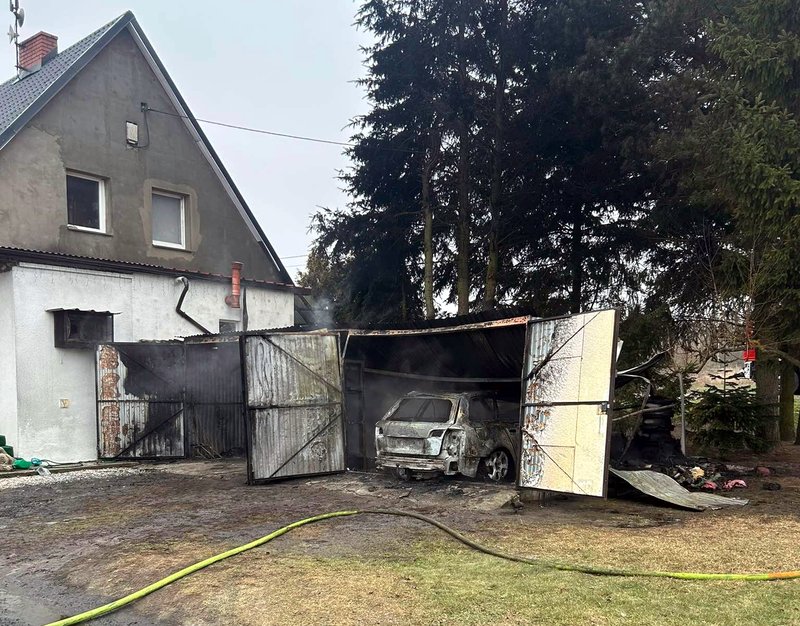 Strażakom udało się ugasić pożar. Mocno uszkodzone są jednak oba garaże oraz samochód stojący w jednym z nich.