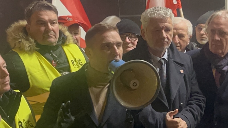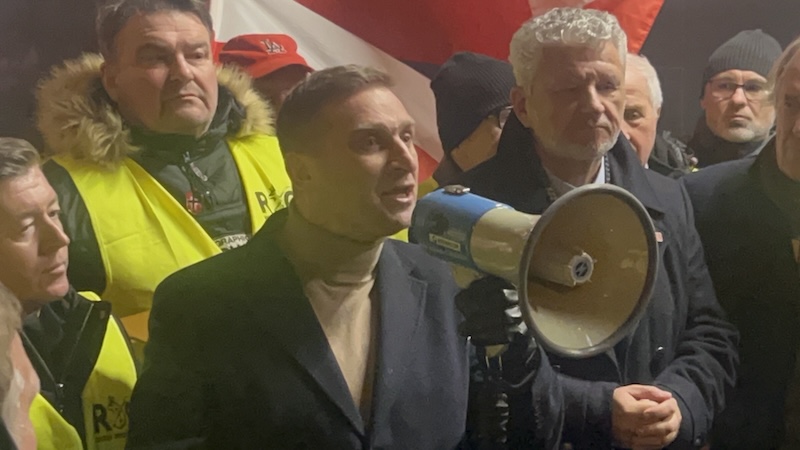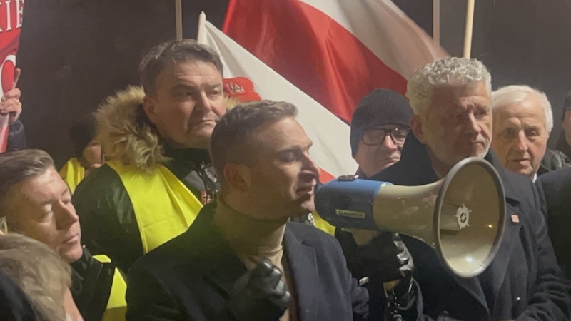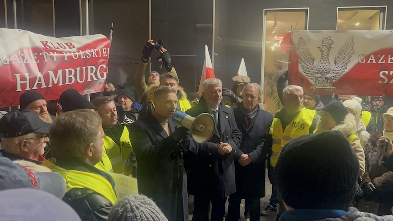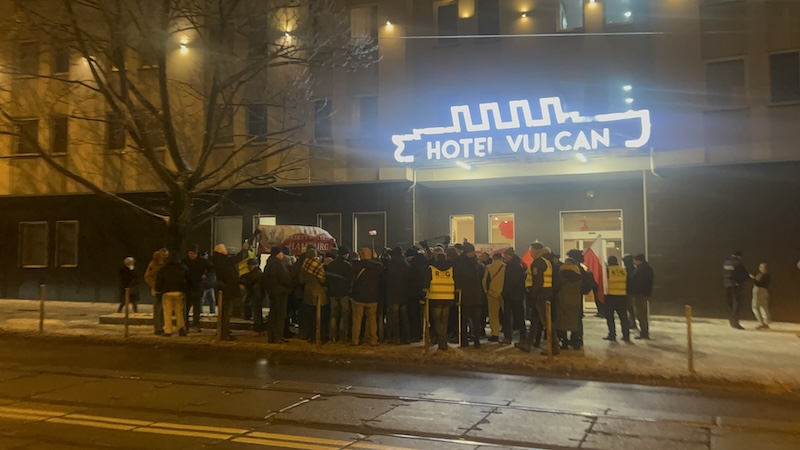 Krótko przed 18.00 zebrało się tam około stu osób, wielu z biało-czerwonymi flagami. Byli członkowie Ruchu Obrony Granic. Na wstępie Robert Bąkiewicz za groźby podpalenia, przemocy wobec właściciela hotelu i wobec własnej osoby odpowiedzialnością obarczył aktualnie rządzących Polską. Mówił wręcz o zdradzie polskich interesów. Wezwał do wspólnego działania ruchów i organizacji prawicowych, by wzmocnić w ten sposób siłę oddziaływania. Za wielki sukces Ruchu Obrony Granic uznał decyzję rządu o skierowaniu na granicę funkcjonariuszy Straży Granicznej i policji po fali społecznych protestów w ubiegłym roku. O groźbach organizatorzy powiadomili policję.