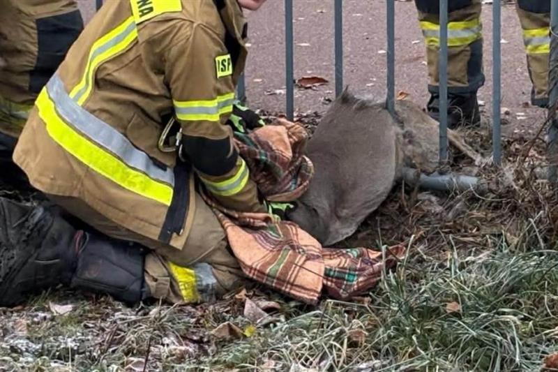 Strażacy z Ochotniczej Straży Pożarnej w Korzystnie uratowali sarnę. Zwierzę zakleszczyło się między szczeblami ogrodzenia znajdującego się w sąsiedztwie ścieżki rowerowej między Korzystnem a Przećminem.