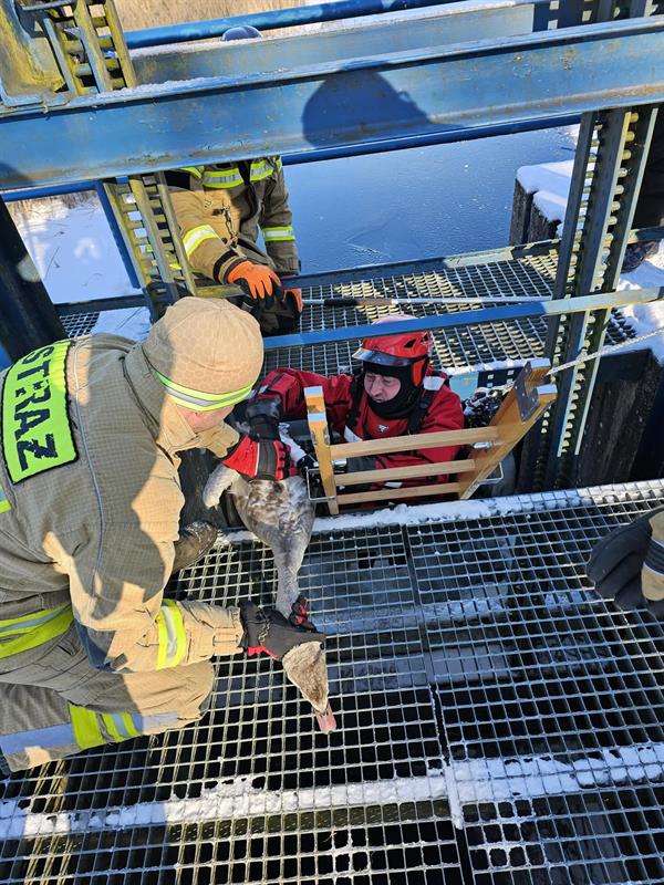 Na miejsce zdarzenia, do miejscowości Bytowo, zadysponowano zastęp druhów z Dobrzan. Po dokonaniu rozpoznania ratownicy przystąpili do działań, zachowując szczególną ostrożność, aby nie spłoszyć ani nie zranić ptaka. Ograniczona przestrzeń oraz betonowa konstrukcja kanału znacząco utrudniały akcję, jednak dzięki doświadczeniu, opanowaniu i odpowiedniemu podejściu strażakom udało się bezpiecznie uwolnić łabędzia z pułapki.