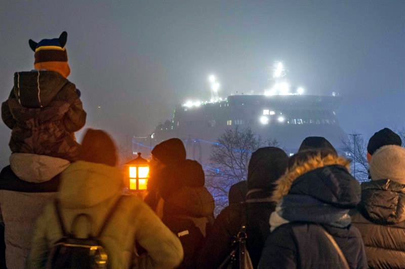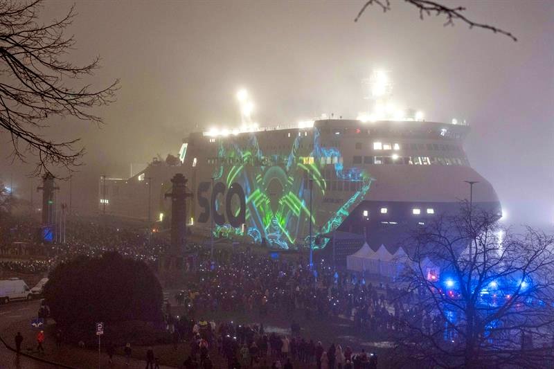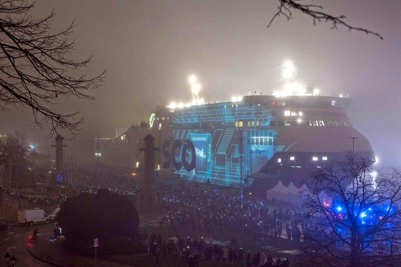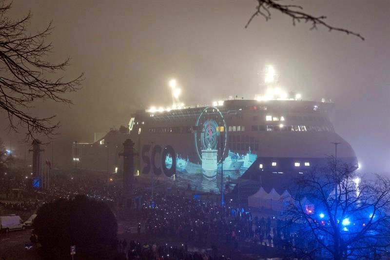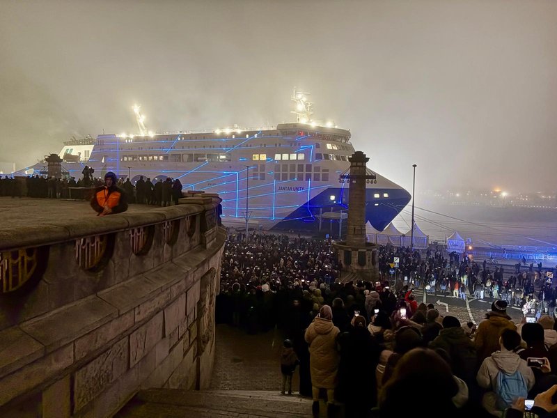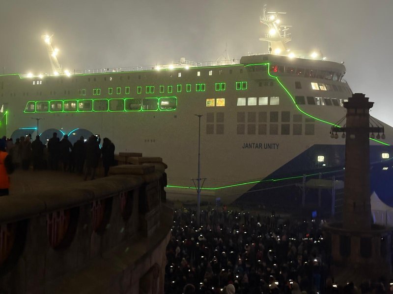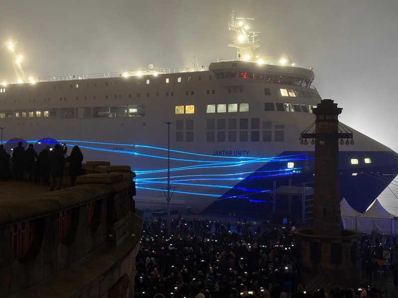Tłum widzów zebrał się w sobotę (17 stycznia) wieczorem, by obejrzeć mapping wyświetlany na zacumowanym w Szczecinie promie „Unity Jantar”.