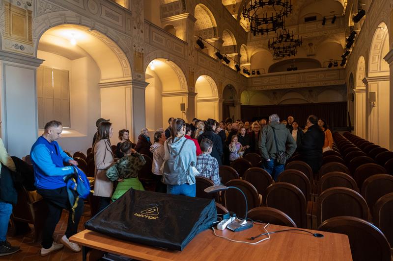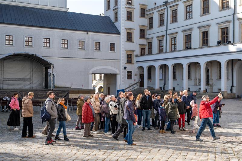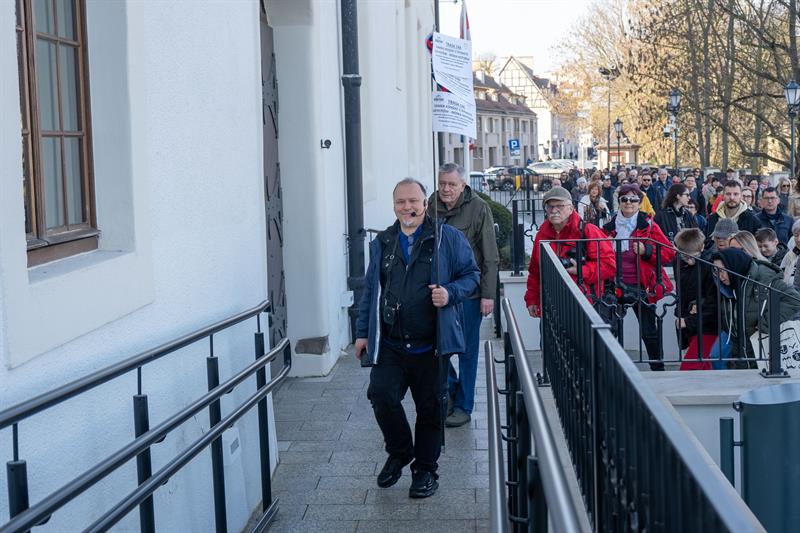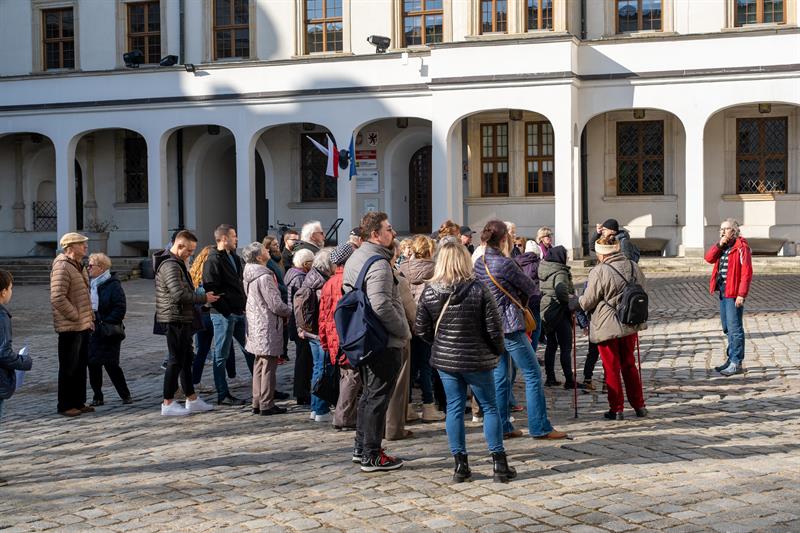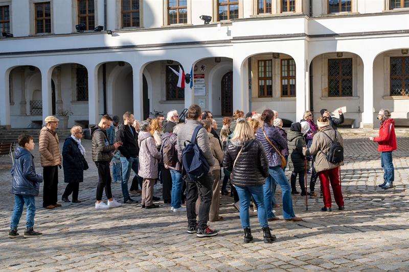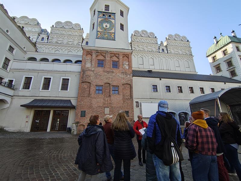Jednym z najpopularniejszych punktów programu okazało się zwiedzanie odrestaurowanego północnego skrzydła Zamku Książąt Pomorskich. Na trasę z Tomaszem Wieczorkiem przyszło ponad 200 osób, które – aby zwiedzanie mogło przebiegać sprawnie – podzielono na trzy grupy. Już na dziedzińcu było widać, że dla wielu uczestników to pierwsza okazja, by zobaczyć z bliska efekty wieloletniego remontu.