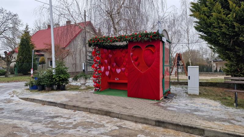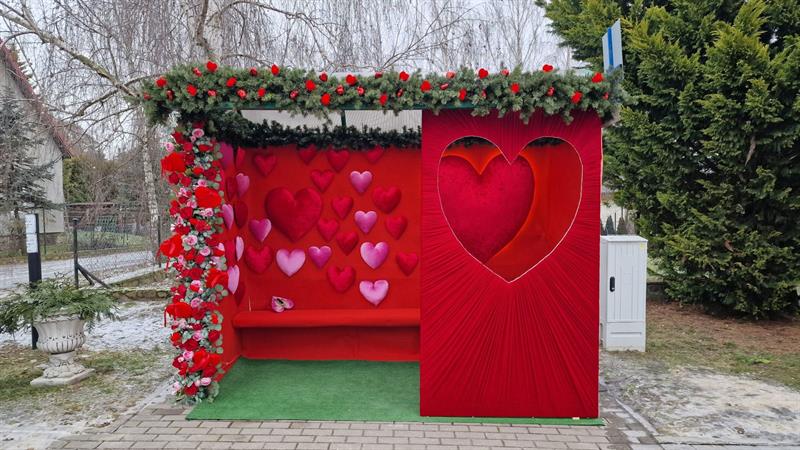Kiedy nadszedł czas na zdjęcie dekoracji świątecznych, mieszkanki Moczył postanowiły nie zostawiać przystanku pustym. Wykorzystując czerwone tło, które pozostało po dekoracjach świątecznych, panie z lokalnego Koła Gospodyń Wiejskich wspólnie z panią Magdaleną stworzyły nową, romantyczną odsłonę obiektu.