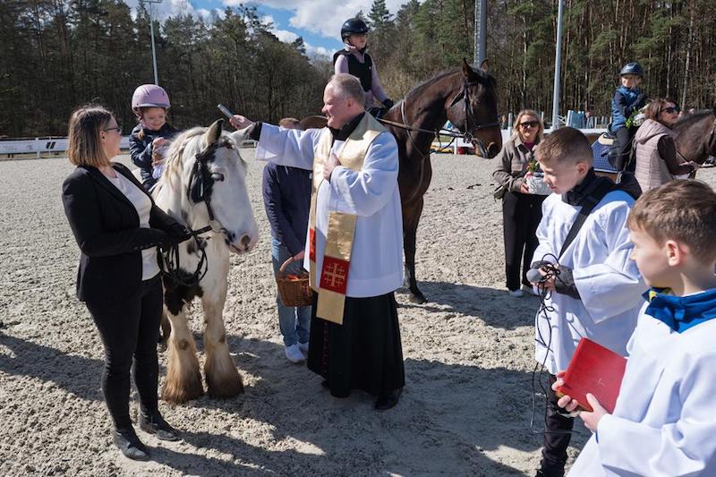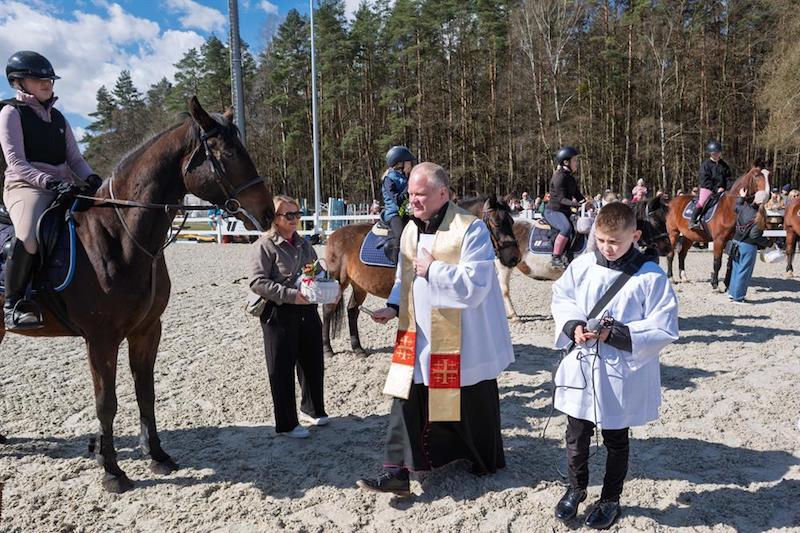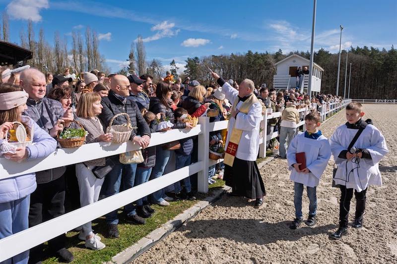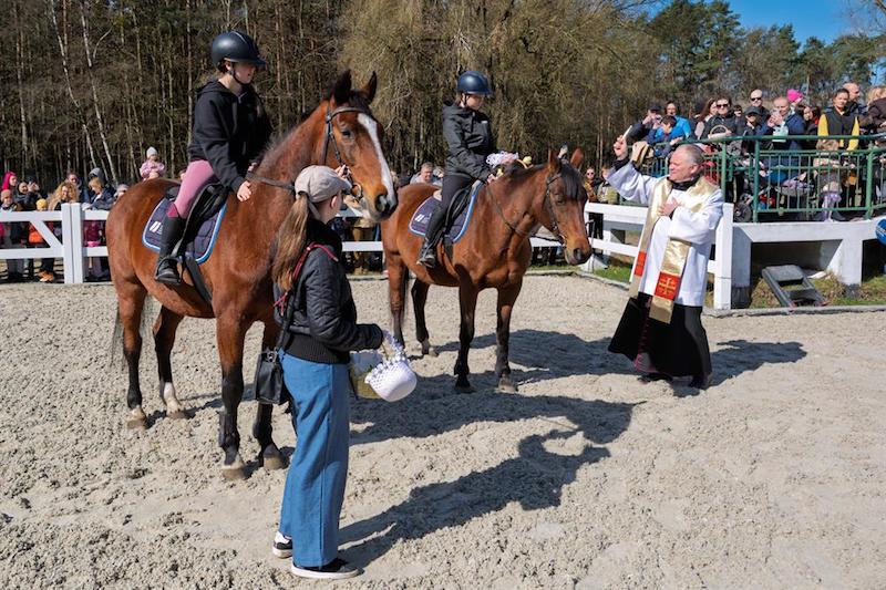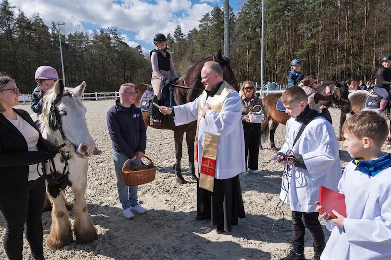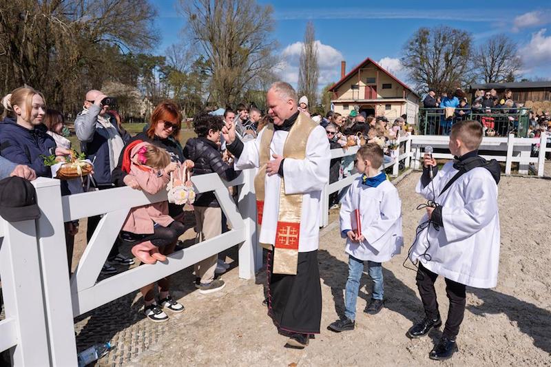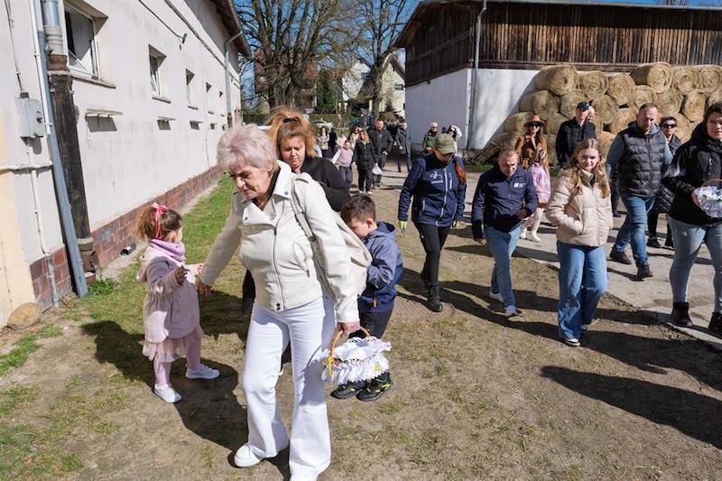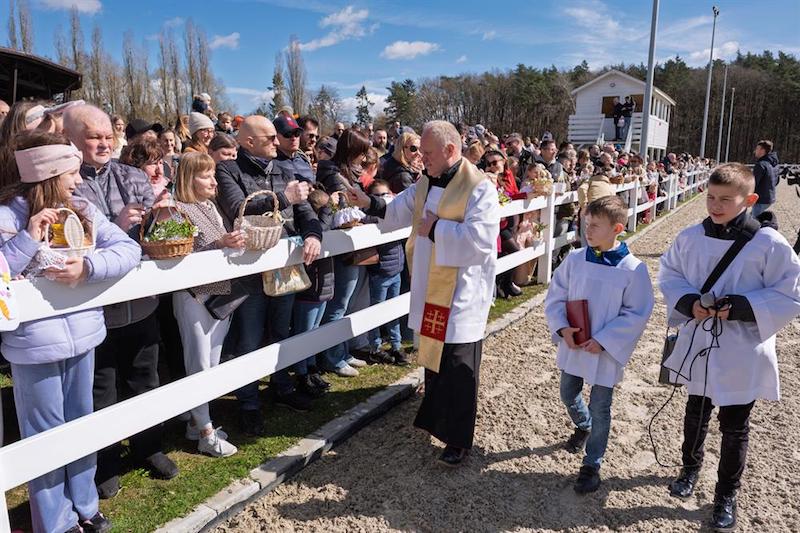 Na placu ośrodka zgromadzili się wierni z koszyczkami, a towarzyszyli im jeźdźcy na koniach, co stanowi stały element tutejszych obchodów. Uroczystość zachowuje swój specyficzny charakter, integrując lokalną społeczność wokół symboliki odradzającego się życia i nadchodzących świąt.