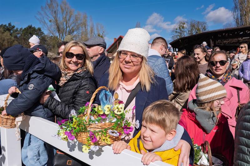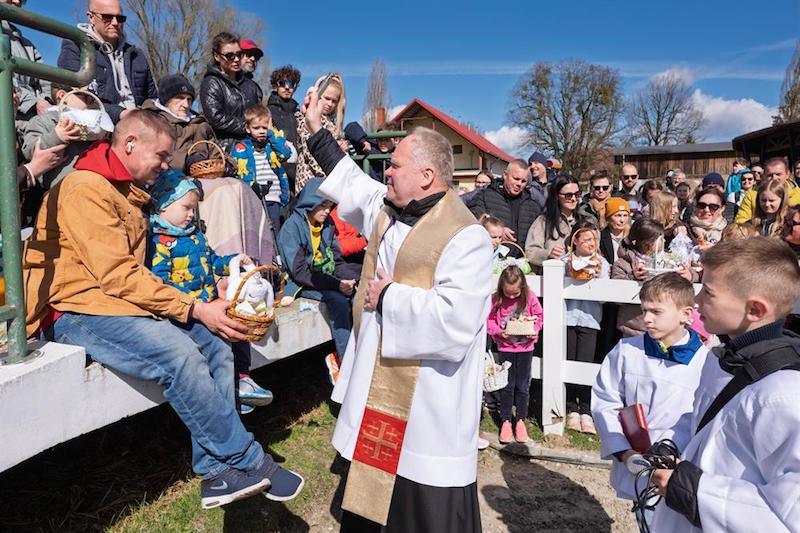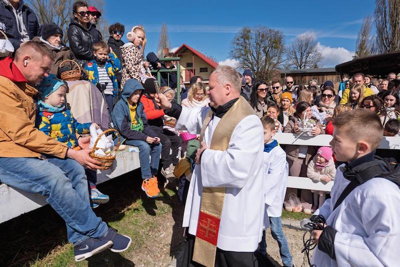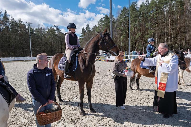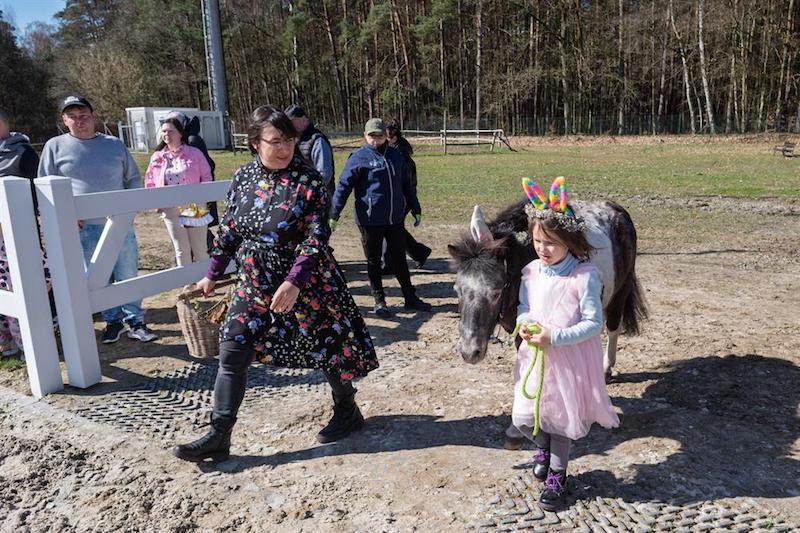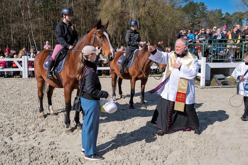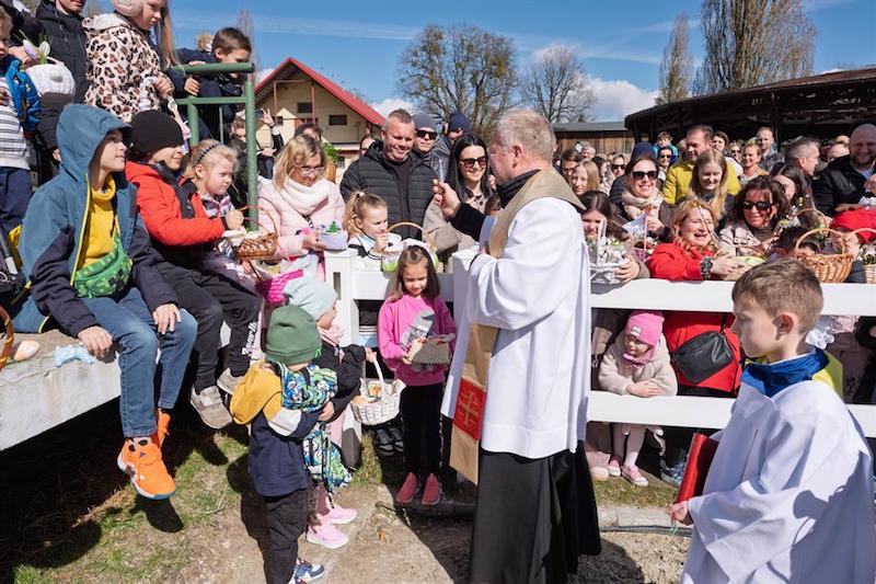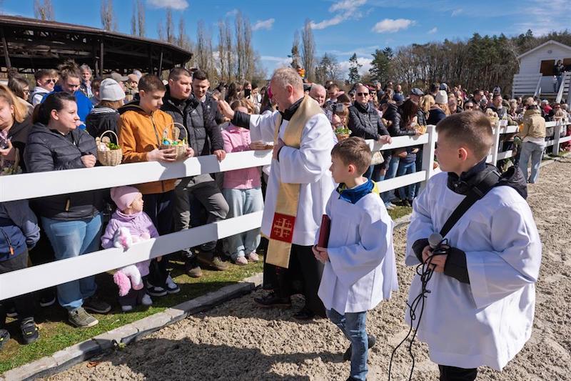 Na placu ośrodka zgromadzili się wierni z koszyczkami, a towarzyszyli im jeźdźcy na koniach, co stanowi stały element tutejszych obchodów. Uroczystość zachowuje swój specyficzny charakter, integrując lokalną społeczność wokół symboliki odradzającego się życia i nadchodzących świąt.