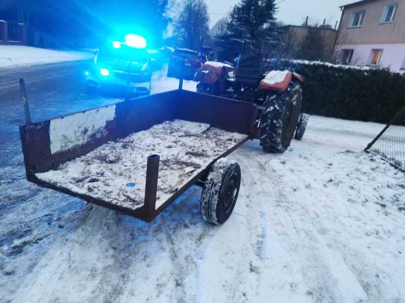 To jednak nie był koniec problemów kierującego. Mężczyzna posiadał aktywny zakaz prowadzenia pojazdów mechanicznych, a ciągnik którym się poruszał, nie był zarejestrowany, nie posiadał obowiązkowego ubezpieczenia OC ani numeru VIN. Te same uchybienia dotyczyły przyczepy, z którą jechał.