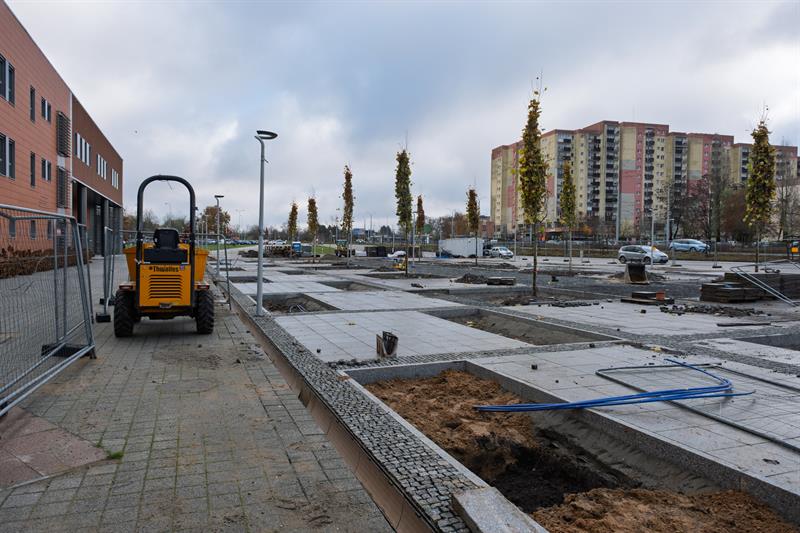 Za inwestycję odpowiada miasto Szczecin, a nadzór prowadzi Miejski Ośrodek Sportu, Rekreacji i Rehabilitacji. Wykonawcą robót jest firma Usługi Budowlane Wiesław Furtak, która prowadzi zarówno prace ziemne, jak i przygotowania do nowych nasadzeń oraz układania alejek. Jak informuje Dariusz Sadowski z MOSRiR, w ubiegłym tygodniu rozpoczęło się sadzenie drzew i potrwa jeszcze przez najbliższe kilka dni. Wzdłuż przyszłej alei widać już pierwsze posadzone platany i klony, a kolejne miejsca są przygotowywane pod następne nasadzenia. Równocześnie usuwane są fragmenty betonowej nawierzchni, dzięki czemu na placu stopniowo pojawia się miejsce dla zieleni i nowych ciągów pieszych.