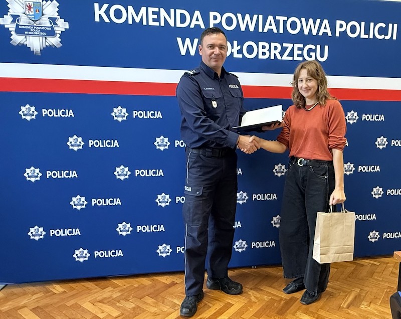 Za wzorową postawę i uczciwość Komendant Powiatowy Policji w Kołobrzegu mł. insp. Marcin Pilarczyk wręczył kobiecie drobny upominek i podziękowania.